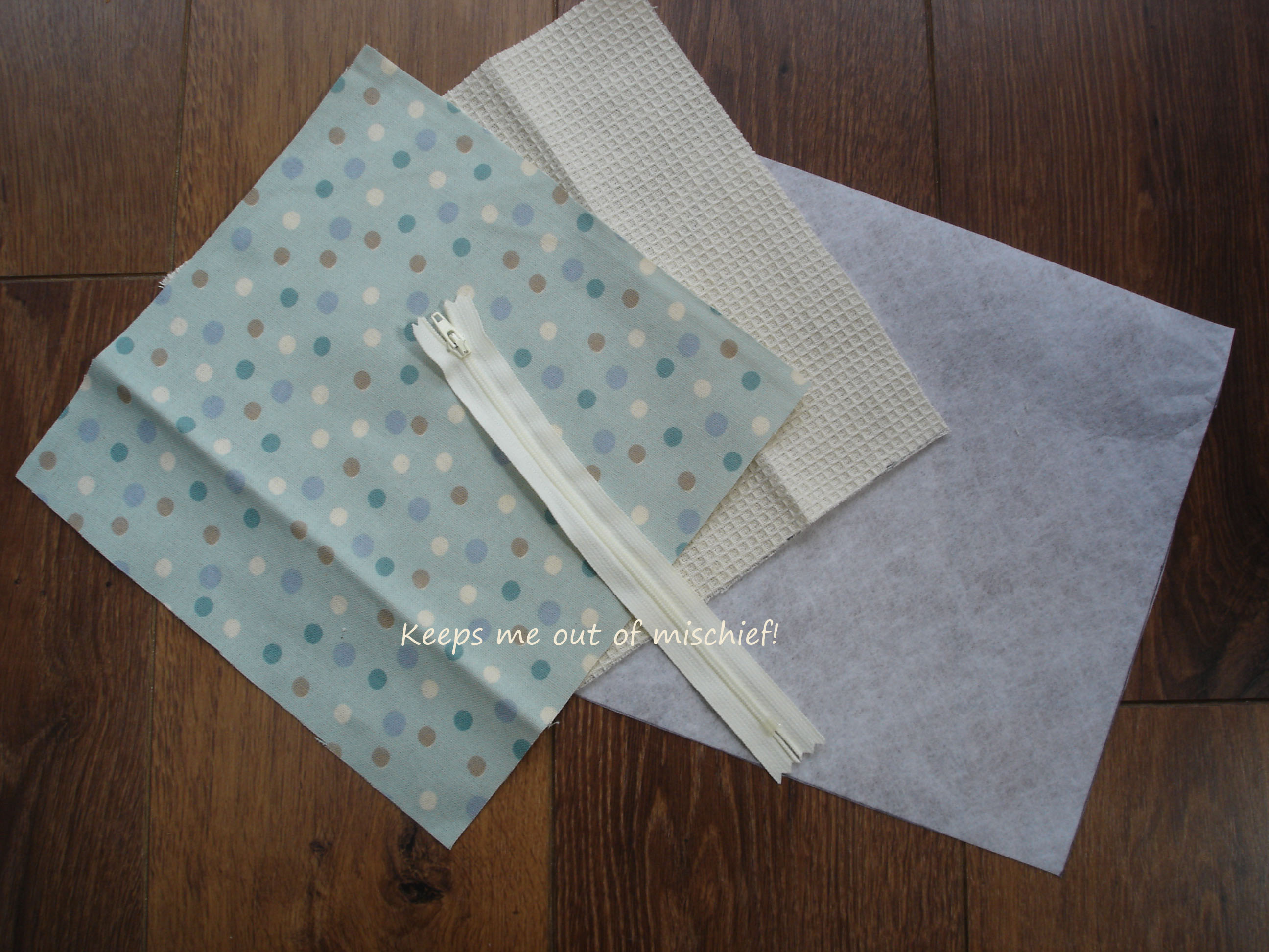 You will need: a piece of outside fabric, a piece of lining fabric and a piece of interfacing that are all 23 x 23 and a 20cm zip in a suitable colour.