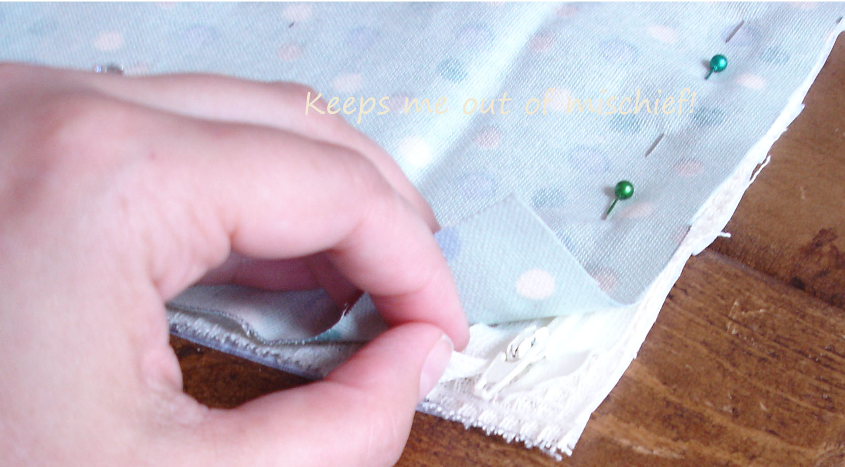 Remove all of the pins and open the zip inside, it will be a disaster if you don’t! Pin and sew along the seams indicated below – make sure you leave a gap between the two marks.