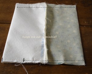 Fold the pieces of fabric around so you repeat the process with the other ends of the fabric, the patterned side of of you outer fabric should be together and the lining fabric should be ‘inside’ too; this is what it should look like once it’s done.