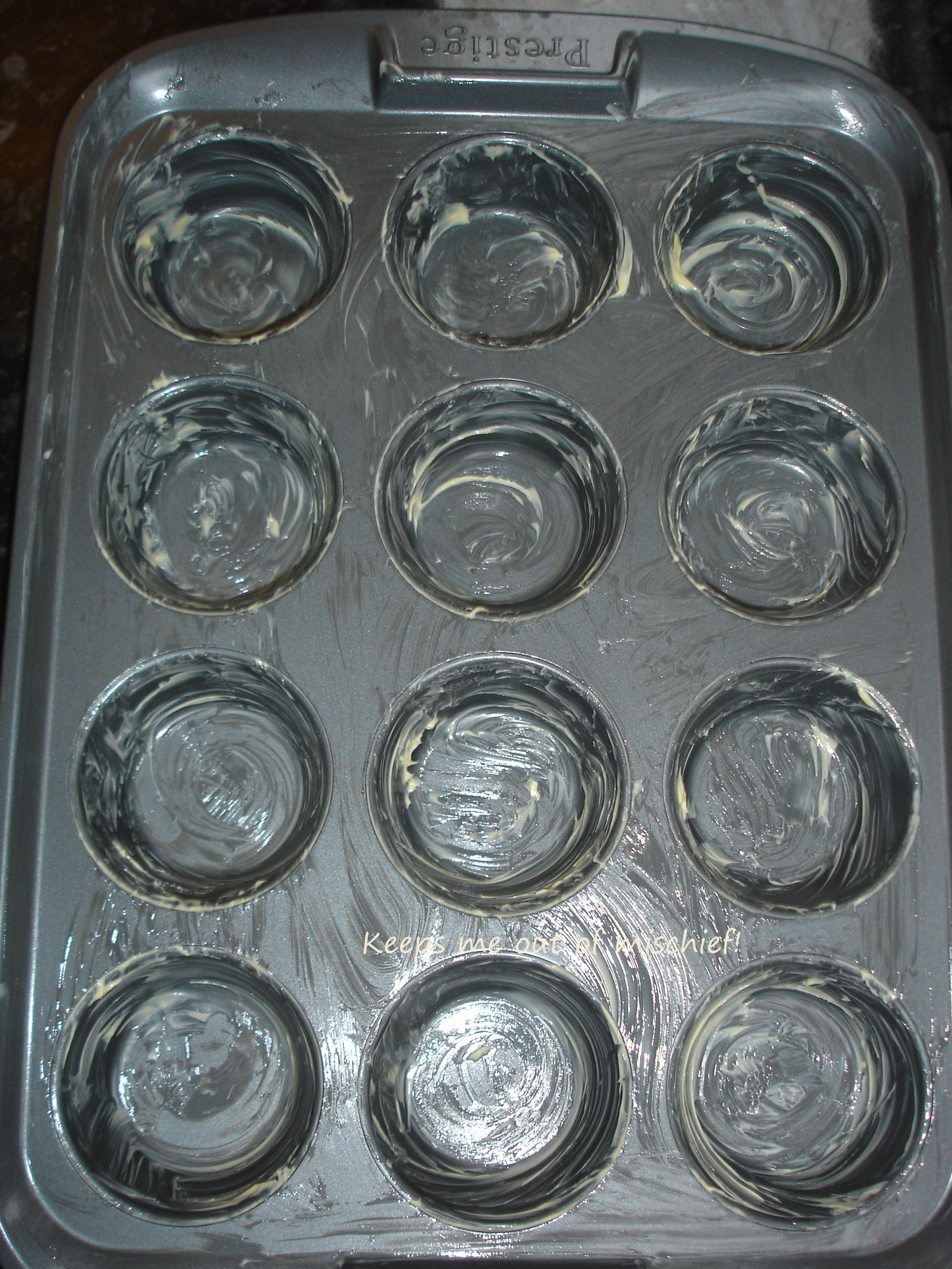 Firstly you need to grease your muffin tray – I know it’s non-stick but I don’t trust it with these babies! I could line each dish with a muffin case but then I’d just be taking them all off at the end! So grease away! Preheat the oven to 190°C.