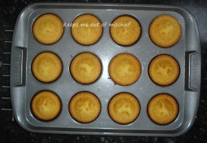 Cream together the butter and sugar, add the eggs one at a time and mix in thoroughly. Sift the flour and add to the mixture. Share out into the muffin tray making sure the batter is fairly flat in each compartment. Place in the oven for 20 minutes or until a skewer stuck into the middle of the cake comes out clean. Allow the cakes to cool in the tray. Use a plastic implement to get them out – be gentle. I have a plastic picnic knife that I keep for occasions like this – they came out fairly easily. Good greasing!