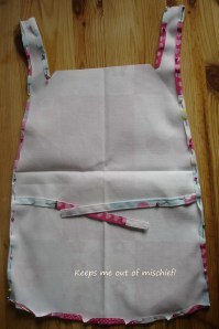The other day I told you about the new fabric shop I had discovered. This is the first project using material that I bought that day. They had some pre-printed tabard type aprons which I have seen ready made in the shops so I bought a set of three for the bargain price of £3.50. They were slight seconds, which explained why they were so cheap, but they were good enough for a little experiment. I made the yellow one up first adding ribbon ties at the sides so she couldn’t take it off.