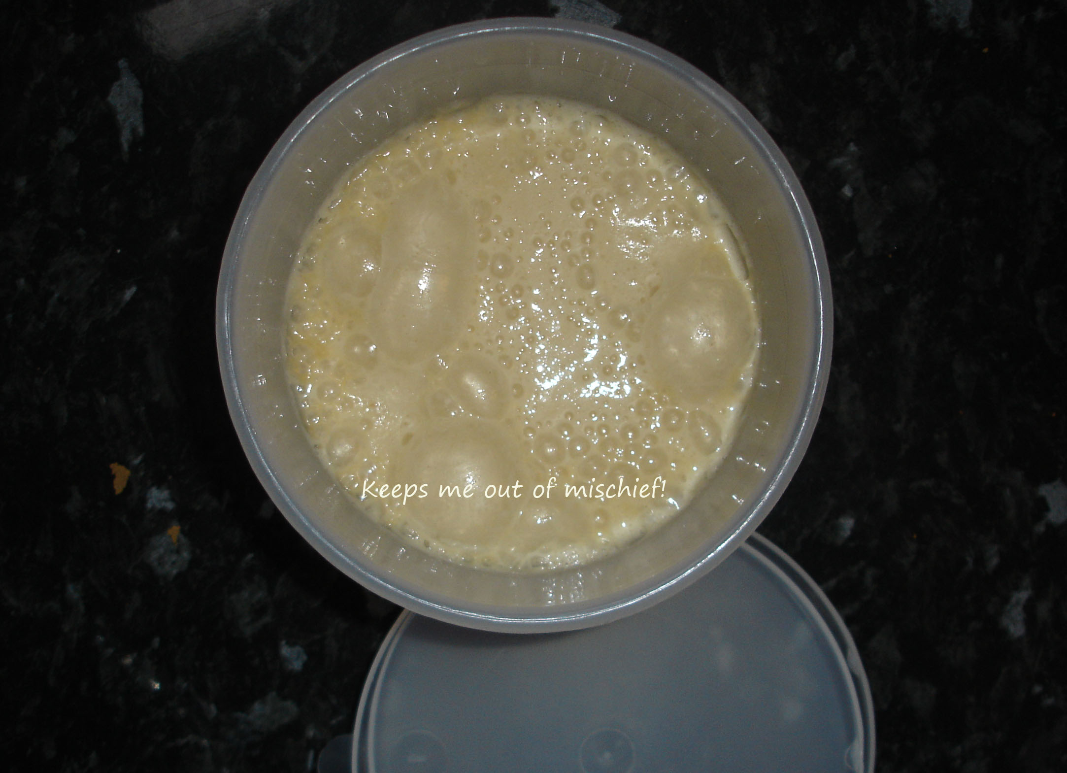Yeast.  Pure and simple.  He’s growing everyday; either because I have to add some more ingredients or because the yeast is doing its work.  After I’ve fed him a bit more I will have to split him into four portions and then give three of the portions to friends and then add some more ingredients to the final portion that I keep and then cook him.