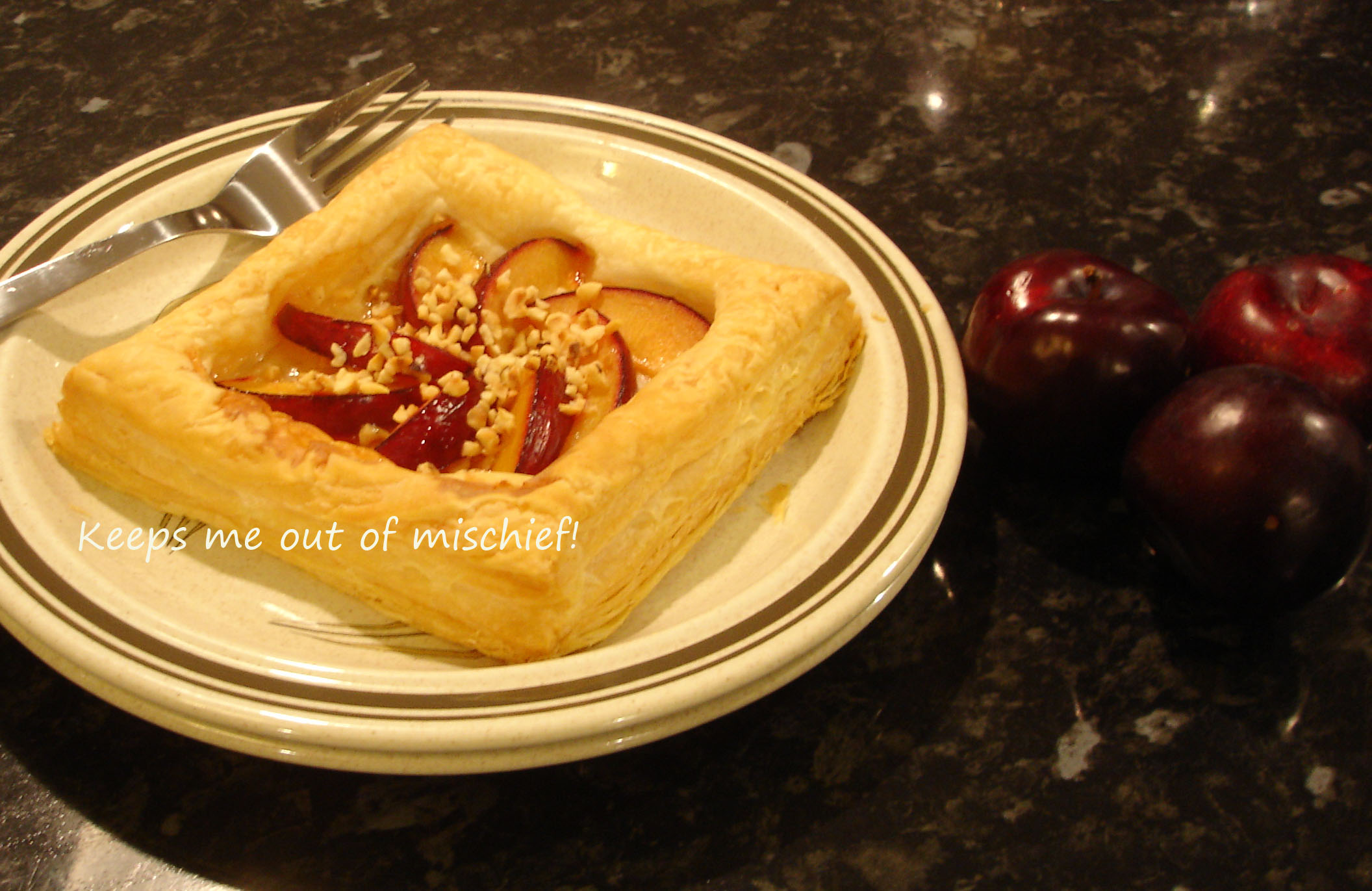 Score a square in the middle of the puff pastry which leaves a border of about 2cm all the way around. Use a fork to prick inside this square. Slice the plum and arrange in a fan shape. Drizzle over the honey and sprinkle the nuts over the top Place in a 200°C oven for about 12-15 minutes until the puff pastry turns golden brown.