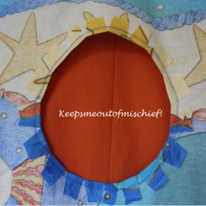On the reverse of the front fabric measure down about 25cm and, using a dinner plate or similar, draw a largish circle. This needs to be big enough for you to reach through with a smallish piece of clothing in your hand. mark another circle approximately 2 cm inside this circle and cut out the inner circle. Cut out towards the outer circle and fold each wedge back before you sew around to form the clothes hole.