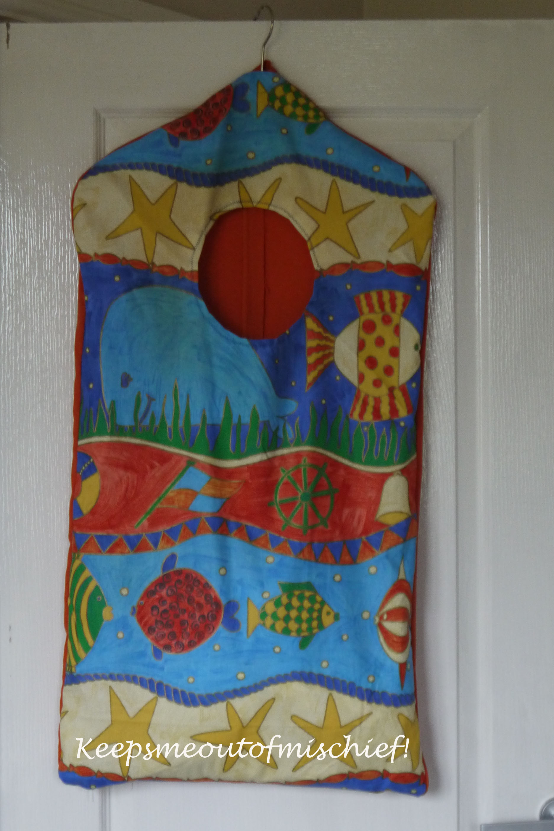 Another nap for Baby B, another sewing session for Mummy! As a child we had a washing bag that was similar to this hanging in our bathroom. My mum was determined to train her girls to tidy their clothes up after they’d worn them! My favourite trick was to completely fill it whenever I was told to tidy my bedroom – this resulted in a very clean bedroom with no clothes on the floor but a very annoyed mother who now had a pile of washing to do! To make it easier for me to save me taking every piece of dirty clothing to the hamper in our bedroom while Baby B is young I decided to make a version using some of the leftover curtain material.