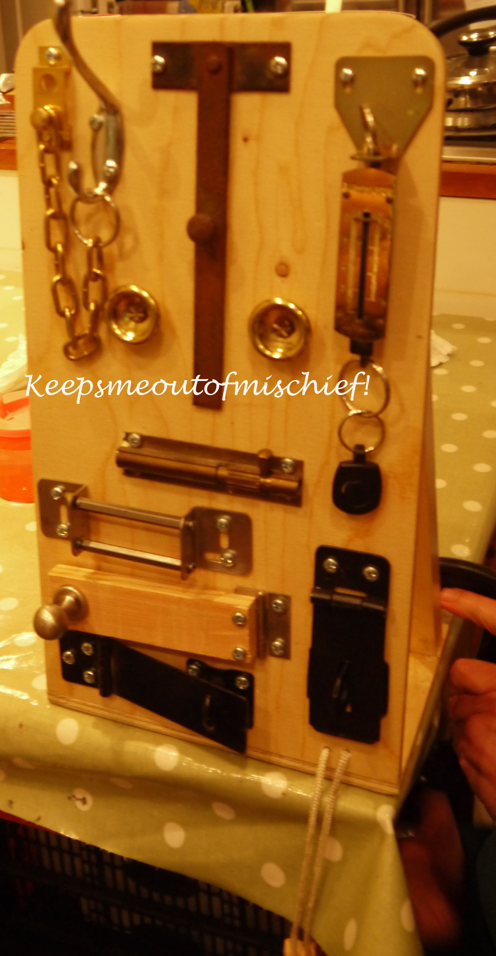 I showed him this idea that I had pinned on my ‘Kids’ Pinterest board.  He ferreted around his garage to see what bits and bobs he had floating about and made this busy board – keeps little B entertained when I’m preparing meals!