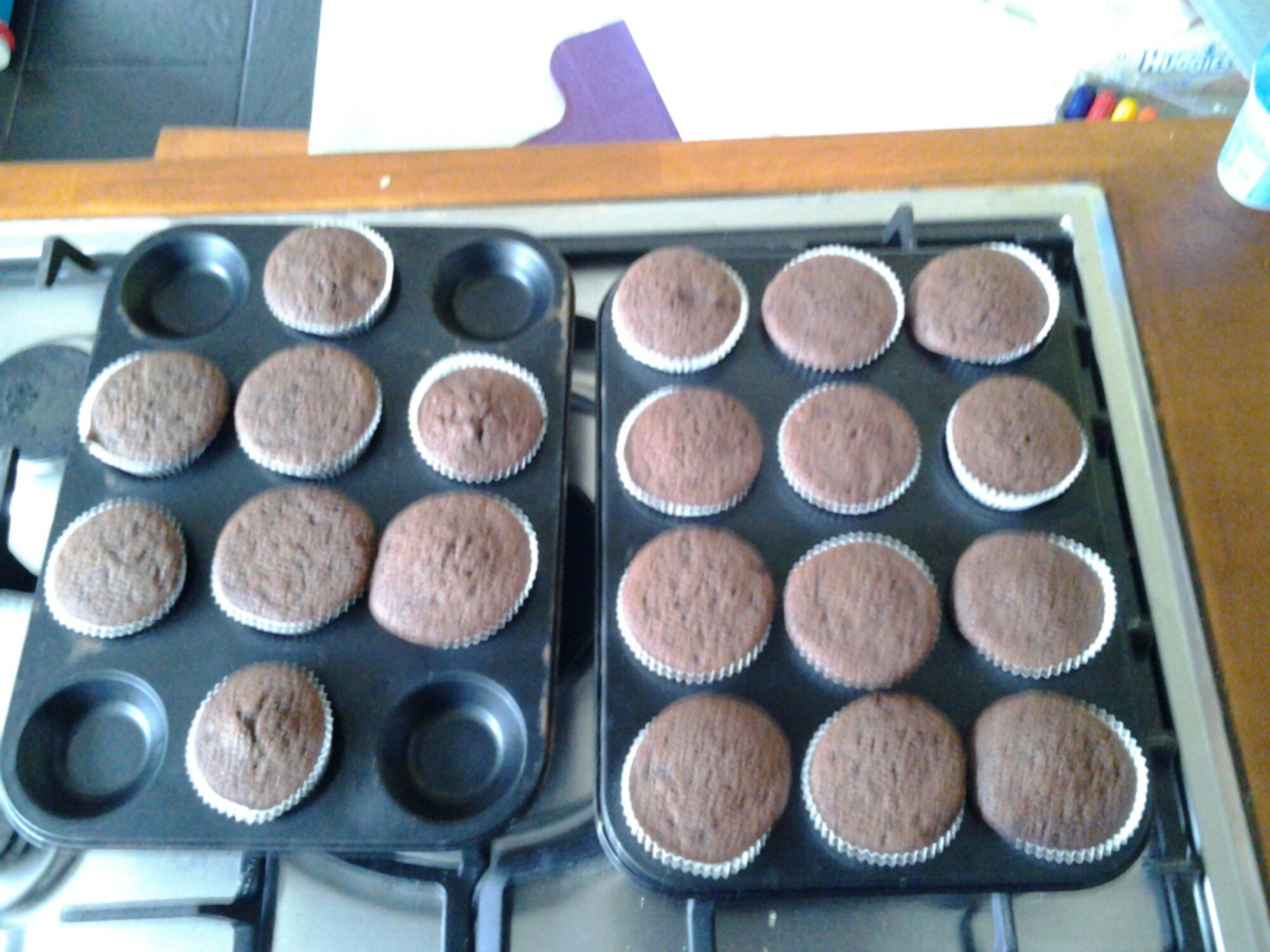 Preheat the oven to 180 C and line a cupcake tray with 20 paper cases (what I would call kids cases- the little ones). Cream together the butter and sugar in a large bowl and add the eggs one at a time. Add the flour and cocoa powder and attempt to keep it in the bowl as you mix (little people don’t seem to understand the need to keep it in the bowl and would rather your kitchen looked like a snowstorm had hit it!). Stir in the baking powder and yoghurt. You should have a batter that looks like whipped double cream. Place the mixture into the prepared paper cases and cook for 18-20 minutes or until the tips spring back up when prodded. Now explain the need for them to cool before eating to a rather grumpy 22 month old – good luck!