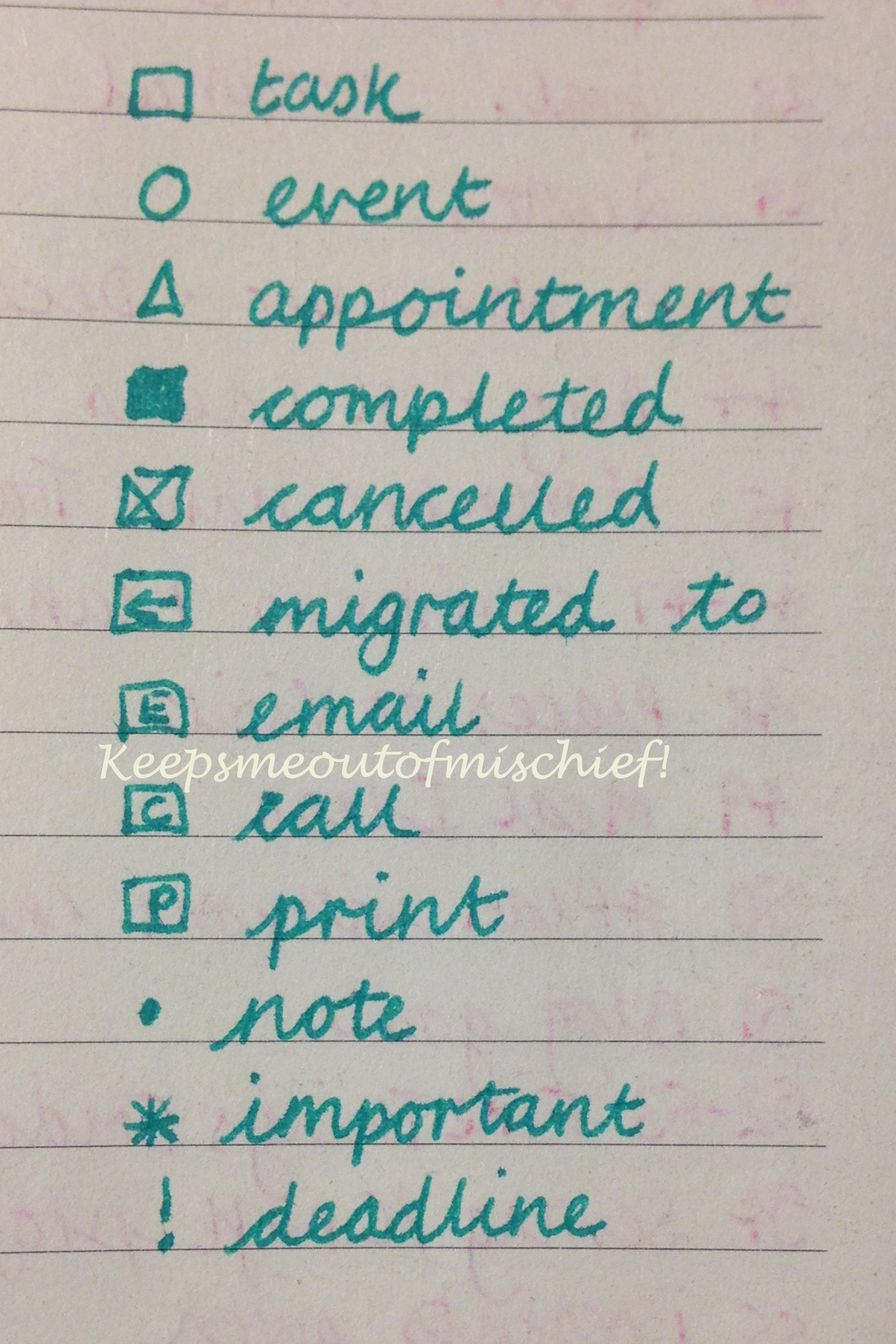 The legend is the codes that you use for all of your entries. I’m using a slightly different version than the original method, but again, I’ve adapted it for my needs. It’s quite an intuitive set of symbols and I’ve not needed to refer to this legend at the front since the first day I started to use it.
