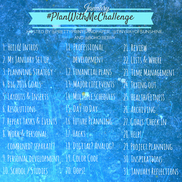 For those of you who might be interested in joining in the January Plan With Me Challenge hosted on Instagram by @prettyprintsandpaper, @tinyrayofsunshine and @bohoberry, here’s the prompt list: