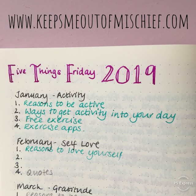 I’m learning to set myself small, achievable targets and not to beat myself when I don’t achieve them – it’s just a blog, right. I decided to set myself a target of posting every Friday, going back to the ‘Five Things Friday’ that I’ve used in the past and, to make creating content slightly easier, I decided to link it to the themes of my Mental Health prompts on my Instagram.