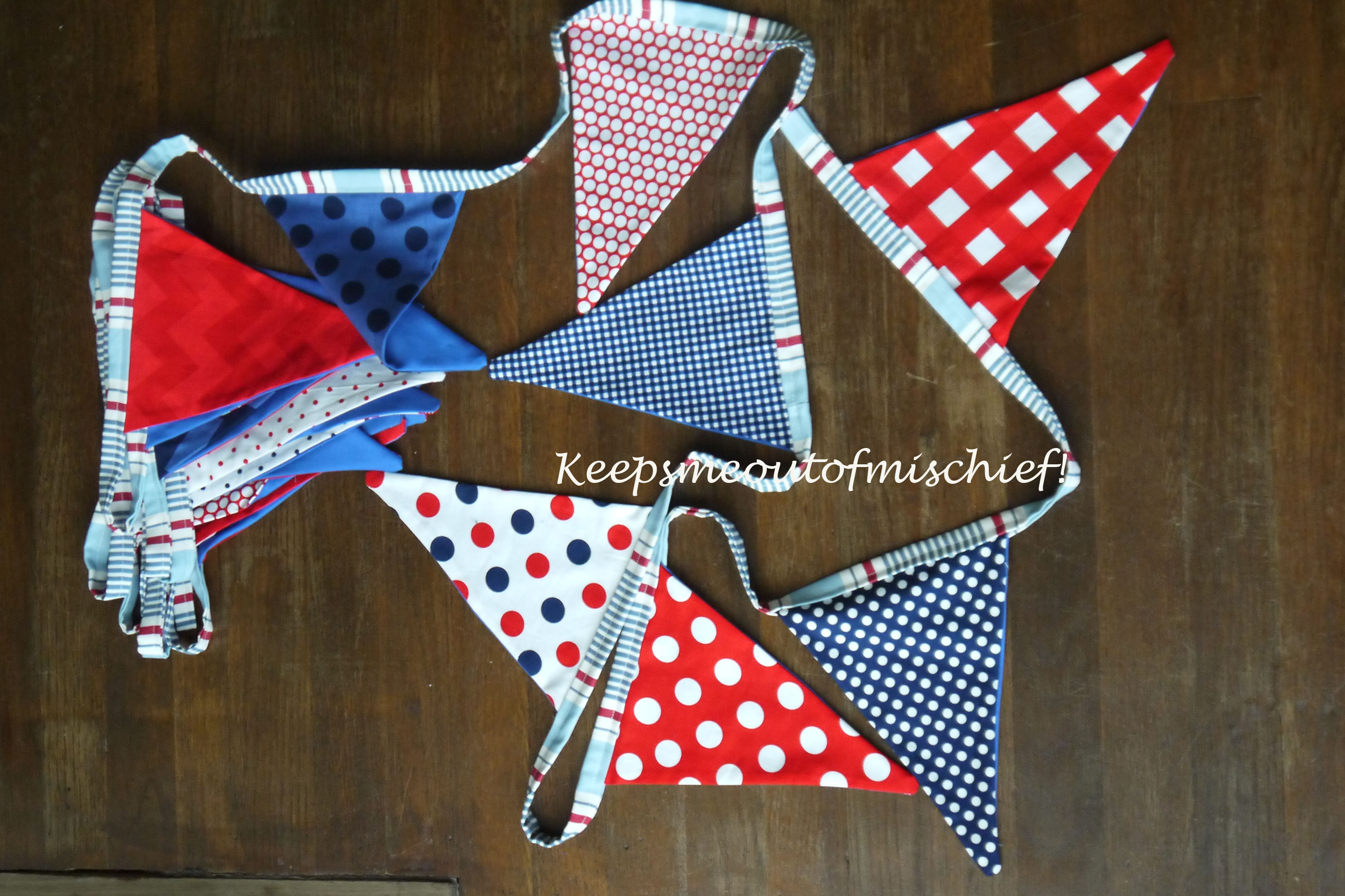 I bought fabric for about four different projects (that hopefully will get made!) but the first was this bunting for B’s bedroom.  Rather than buying lots of different fabrics I bought two of these pre-printed bunting panels by Riley Blake and used some plain blue sheeting to back it with.  The binding along the top is made from the curtain fabric to tie the room together.    It went together beautifully and looks great strung up around the ways of the room.