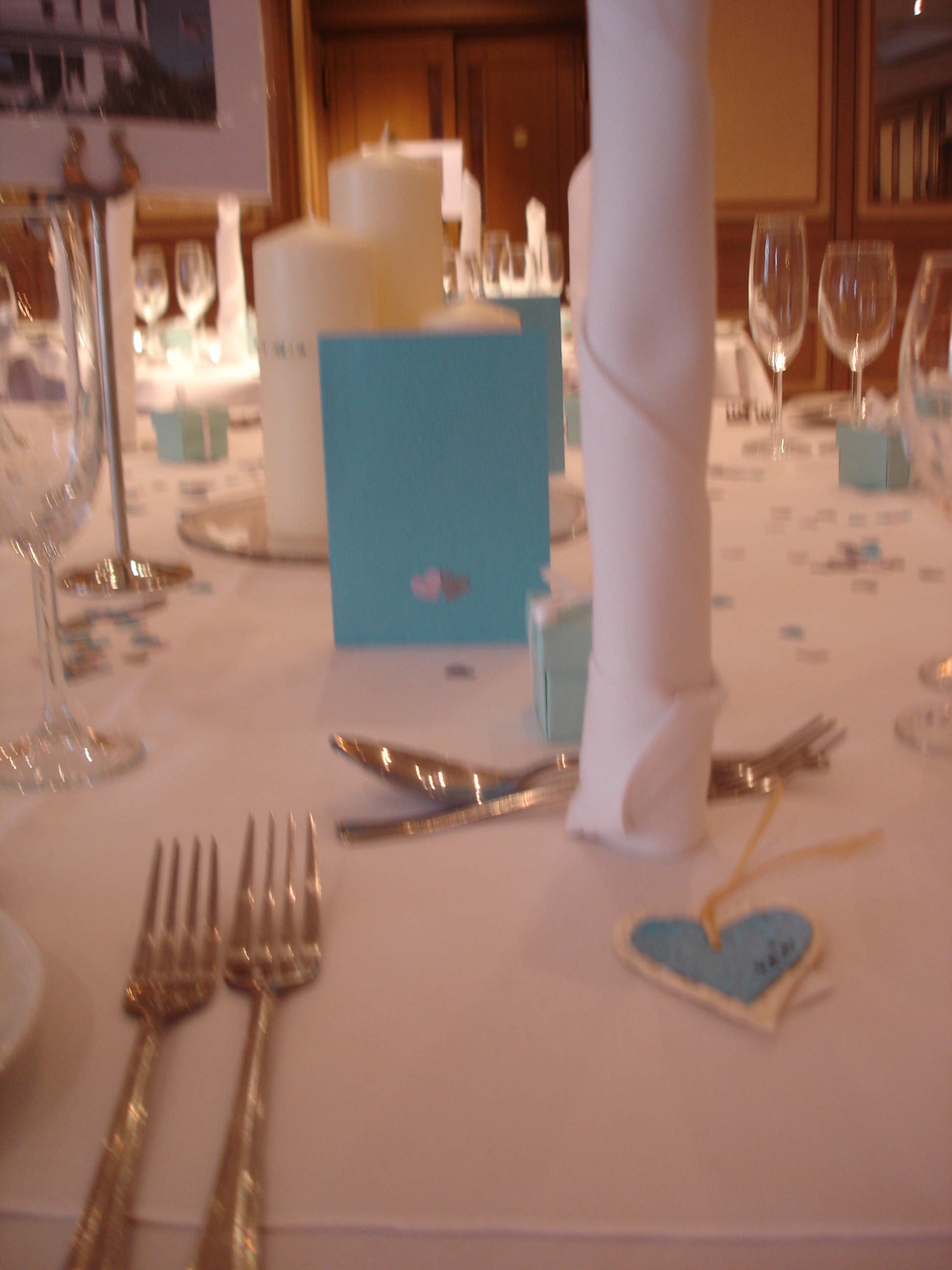 I spent hours stamping out those confetti hearts in our colours! The menus on the table were the same as our invitations. The wild flower seed hearts came from ebay, we used them as placecards. My sister made the beaded wires to go around the candles; after the wedding we took all the beads off and my sister upcycled them into some jewelery to remind me of my special day.